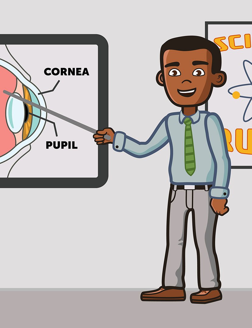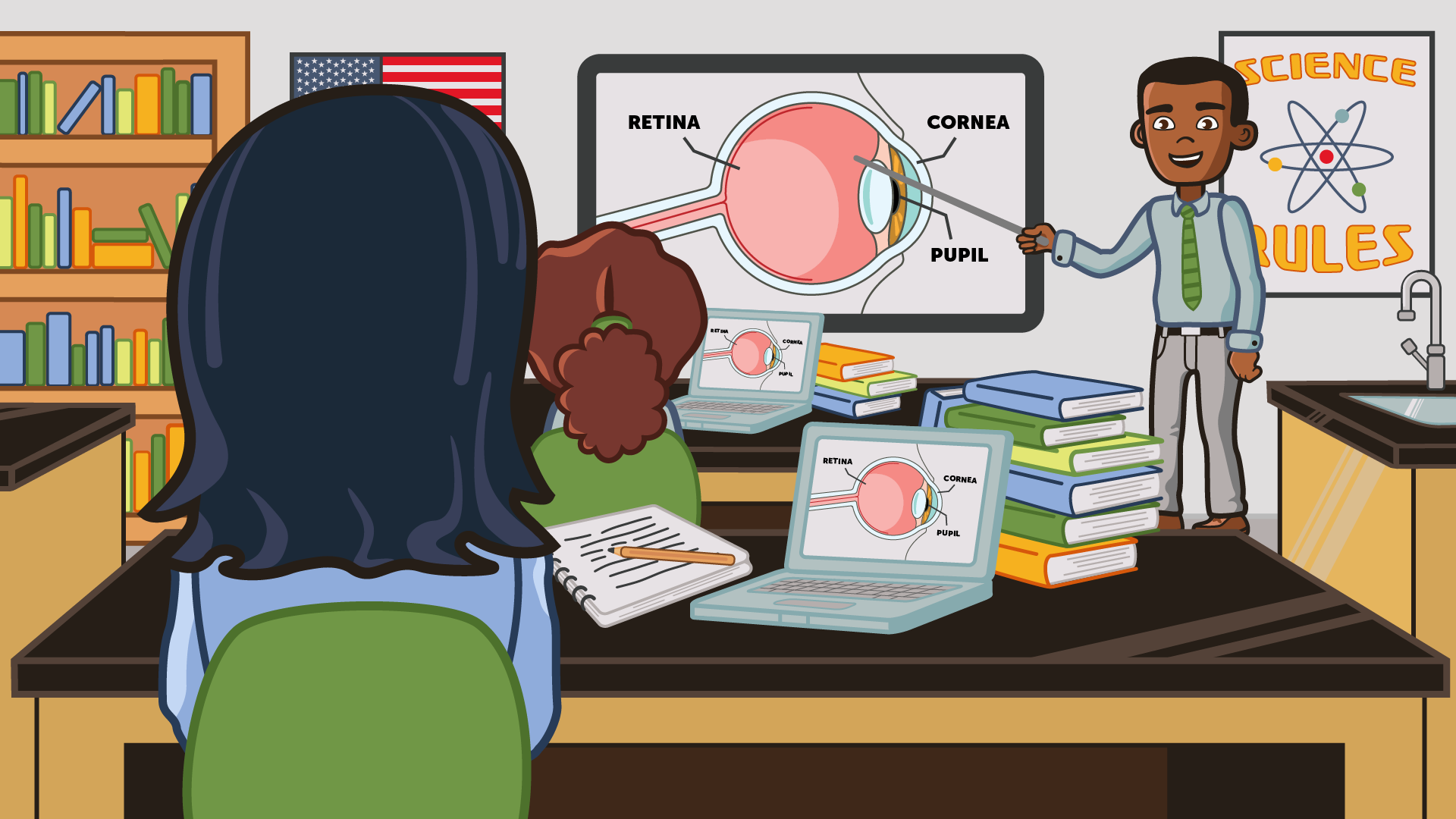 In addition to animating the video I was also tasked with illustrating the interior of a science classroom, which would be seen from several different angles. Plus creating teacher and student characters. I was able to use previous Pearle Vision adverts as a style guide so that my new characters would fit seamlessly into the established world and style.